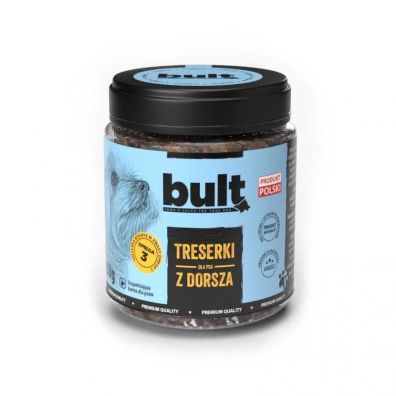 Ein tolles Leckerli für Spaziergänge und das Training Ihres Hundes Take it or leave it? Das ist hier die Frage. Unserer Meinung nach sind die Kabeljau-Trainer ein guter Köder. Mit Kabeljau in der Hand hat man einen Haken für jeden Hund. Er riecht nicht nur lecker, sondern ist auch noch gesund. Mit diesem Snack fängst du mehr als einen Fan von Fischsnacks: Kabeljauschwänze. Der Duft der Meere und Ozeane Mit den Kabeljau-Trainern von bult begeben Sie sich auf ein echtes Meeresabenteuer… an Land. Jeder Kabeljau-Schwanz ist ein getrockneter Snack, dem wir in einem speziellen Verarbeitungsprozess das überschüssige Wasser entzogen haben. Dabei haben wir den Duft verstärkt, so dass Sie sich in wenigen Sekunden wie auf dem Meer fühlen. Wenn Ihr Hund es liebt, sich in Flüssen, Seen und Bächen zu tummeln und den Fischen, denen er begegnet, in den Schwanz zu beißen, wird Dorschschwanz seine wilde Jägernatur zu 100 % befriedigen. Es ist unmöglich, dieses Aroma gleichgültig zu übergehen. Fisch in der Ernährung Ihres Hundes. Warum Kabeljau: Es gibt so viele verschiedene Fische, und wir haben uns für Kabeljau entschieden. Warum eigentlich? Weil wir wissen, welche wertvollen Inhaltsstoffe er enthält. In jedem Kabeljau verstecken sich gesunde Omega-3-Fettsäuren, die eine gute Wirkung auf die Gehirnfunktion haben. Sie machen das Training mit Ihrem Hund viel effektiver! Darüber hinaus locken die Kabeljau-Hundetrainer mit einem natürlich salzigen Geschmack, den kein anderer Hundesnack hat. Er ist eine bemerkenswerte Abwechslung in der Grundnahrung. Vergessen Sie nur nicht, dass jeder Fisch gerne schwimmt, also servieren Sie Kabeljau-Hundetrainer zusammen mit einem Schluck frischem Wasser. DAS MÜSSEN SIE WISSEN! bult-Hundetrainer werden handwerklich verarbeitet. Wir trocknen sie so, dass der Einsatz von chemischen Konservierungsstoffen auf Null reduziert wird. Das ist noch nicht alles! Jeder bult-Hundetrainer, der unsere Produktionslinien verlässt, muss strenge Normen erfüllen. Wir legen sie uns selbst auf, denn für uns gibt es nichts Wichtigeres als Qualität. ZUSAMMENSETZUNG Kabeljaufleisch 50% Produkte tierischen Ursprungs – Geflügelfleisch und Innereien 30% Produkte pflanzlichen Ursprungs – Reismehl 20% ANALYTISCHE ZUSAMMENSETZUNG Rohprotein – 37,1% Fett – 24,4% Gesamtasche – 10,4% Feuchtigkeit – 6,3% Rohfaser – 2,3%