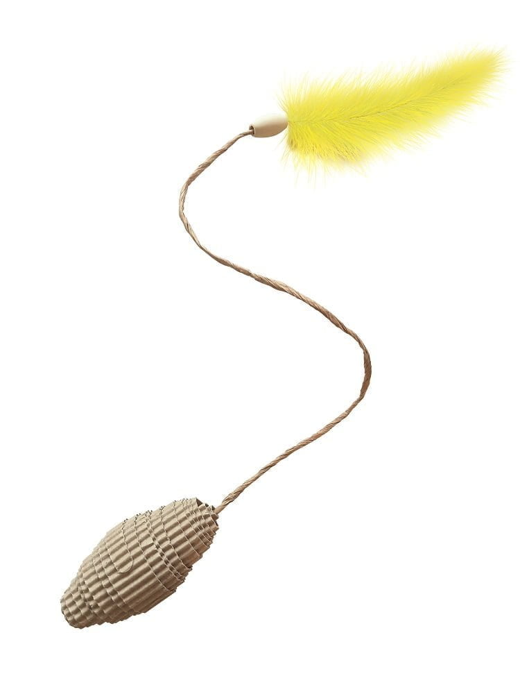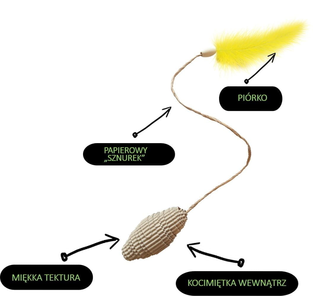 Carton+pets Pappkegelspielzeug mit Feder und Katzenspielzeug ist ein einzigartiges Spielzeug aus angenehm weichem Karton. Das Spielzeug hat eine Papierschnur, die dank ihrer Eigenschaften auf das Spiel der Katze mit dem Kegel reagiert. Im Inneren des Pappkegels befindet sich ein Katzenfutter aus polnischem Anbau (es ist in einer Seidenpapiertüte eingeschlossen). Am Ende des Spielzeugs befinden sich eine Holzperle und eine Feder. Die Federn können in verschiedenen Farben sein. In der Schachtel befinden sich zwei Spielzeuge. Das Produkt wurde in Polen entworfen und hergestellt. Karton ist ein natürliches, recycelbares Material.
