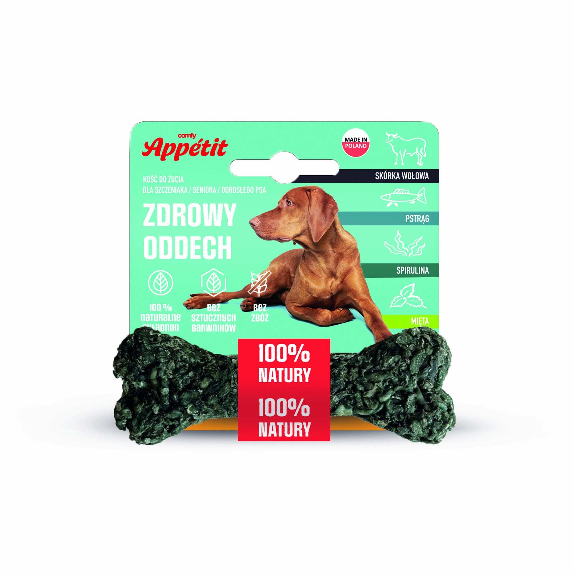 COMFY Appetit Breath ist ein funktioneller Kauknochen, der mit Blick auf die Zahngesundheit Ihres Hundes entwickelt wurde. Das Produkt besteht aus 100 % natürlichen Zutaten, ohne Zusatz von Getreide, künstlichen Farbstoffen, Konservierungsmitteln oder Süßungsmitteln. Der Kauknochen ist mit Inhaltsstoffen angereichert, die antibakterielle, entzündungshemmende und erfrischende Eigenschaften haben, wie Minze, Spirulina und Forelle. Mit einer Länge von 12 cm ist das Produkt ideal für Welpen, erwachsene Hunde und Senioren und sorgt für Mundhygiene und entspannenden Spaß.