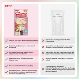 Wenn Sie sich für INABA CAT Churu Thunfisch mit Lachs entscheiden, investieren Sie in die Gesundheit und das Wohlbefinden Ihrer Katze. Diese Leckerbissen vereinen außergewöhnlichen Geschmack und hochwertige Zutaten, was sie zur perfekten Wahl für jede Gelegenheit macht. Die cremige Textur der Leckerbissen sorgt dafür, dass Katzen sie lieben, und ihr niedriger Kaloriengehalt erlaubt es, sie häufig zu geben, ohne sich Sorgen um Übergewicht zu machen. Verantwortungsvolle Zutaten wie Lachs aus nachhaltiger Forstwirtschaft und Huhn aus Freilandhaltung sorgen nicht nur für Geschmack, sondern auch für Sicherheit und Qualität. Die Verpackung ist so gestaltet, dass sie direkt aus der Hand Ihrer Katze gefüttert werden kann, was die Bindung zwischen Ihnen beiden fördert. INABA CAT Churu Thunfisch mit Lachs ist nicht nur ein Leckerbissen, sondern auch eine Möglichkeit, die Beziehung zu Ihrem Haustier zu stärken und für Gesundheit und Vitalität zu sorgen.