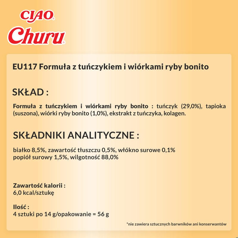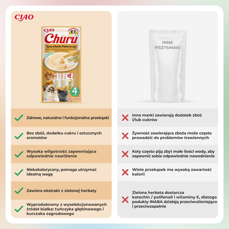 INABA CAT Churu Thunfisch und Thunfischflocken ist ein einzigartiger Leckerbissen für Katzen, die das Beste verdienen. Dieser cremige Leckerbissen kombiniert den Geschmack von Thunfisch und Bonitoflocken und bietet ein außergewöhnliches Geschmackserlebnis, das jedes Schnurren erfreut. Churu ist kalorienarm und enthält keine Körner oder Konservierungsstoffe und ist somit die perfekte Wahl für die Gesundheit Ihres Haustieres. Mit Fleisch von Hühnern aus Freilandhaltung und nachhaltigem Thunfisch bietet INABA CAT Churu nicht nur ein schmackhaftes Erlebnis, sondern auch einen Nährwert, der die Gesundheit und Fitness Ihrer Katze unterstützt.