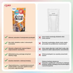 INABA CAT Juicy Bites Fisch und Muschel ist eine einzigartige Kombination aus Geschmack und Qualität, die selbst die Erwartungen der anspruchsvollsten Katzen erfüllt. Ihre Zusammensetzung basiert auf Zutaten höchster Qualität, wie Thunfisch und Hühnerfleisch aus zertifizierten Quellen, die einen hohen Nährwert gewährleisten. Jeder Bissen ist saftig und zart, und die drei separat verpackten Portionen tragen dazu bei, dass sie länger frisch bleiben. Die kalorienarme Rezeptur ohne Getreide, Konservierungsstoffe oder künstliche Farbstoffe ist für Katzen jeden Alters geeignet, auch für solche mit einem empfindlichen Verdauungssystem. INABA CAT Juicy Bites ist ein gesunder Snack, der sich ideal als Belohnung oder als Leckerbissen zur Bereicherung der täglichen Ernährung Ihrer Katze eignet.