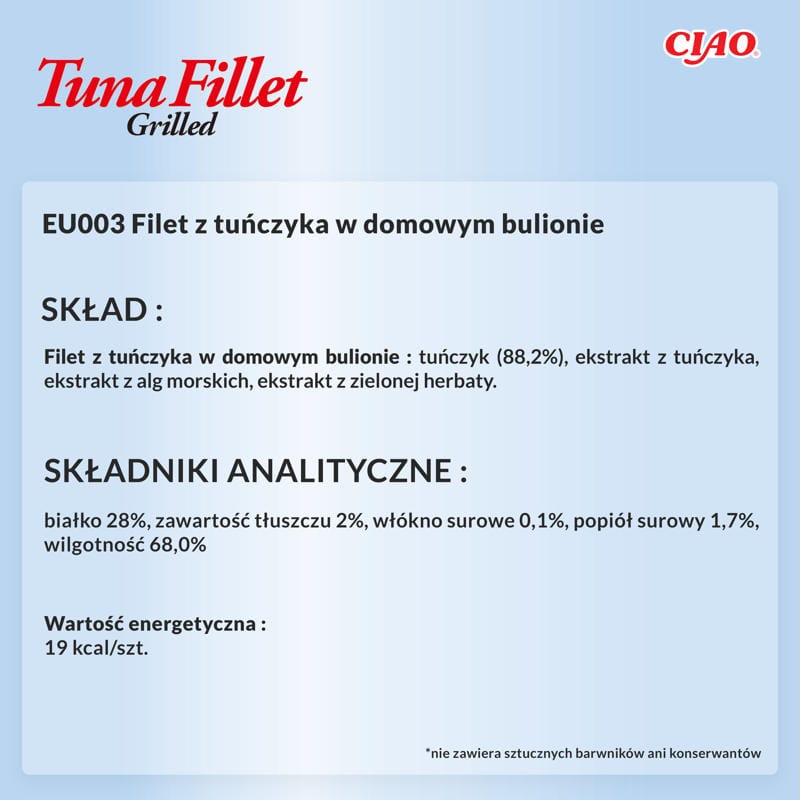 INABA CIAO Gegrilltes Thunfischfilet kann in jedem Alter in den Speiseplan Ihrer Katze aufgenommen werden, insbesondere wenn Ihr Tier wenig Wasser trinkt oder seine Ernährung mit einem leicht verdaulichen, natürlichen Leckerbissen ergänzen muss. Das Filet ist ideal für Katzen mit empfindlichem Verdauungssystem sowie für Katzen, die zu einer Gewichtszunahme neigen. Dank seines geringen Kaloriengehalts ist es auch für ältere Katzen ein gesunder Snack.