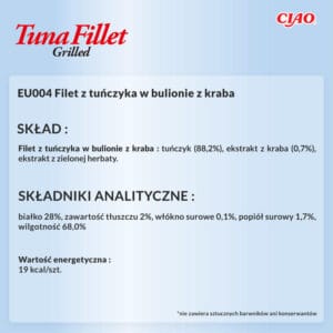 INABA CIAO Gegrilltes Thunfischfilet ist ein Ergänzungsfuttermittel, das für die Gesundheit und das Wohlbefinden Ihrer Katze entwickelt wurde. Dieser Leckerbissen zeichnet sich durch seinen hohen Feuchtigkeitsgehalt aus, wodurch er ideal für Katzen ist, die oft nicht genug Wasser trinken. Die Filets werden sorgfältig zubereitet und der gegrillte Thunfisch wird in eine schmackhafte Krabbenbrühe getaucht. Der Leckerbissen kann direkt aus der Hand serviert werden, was einen engen Kontakt mit Ihrem Haustier ermöglicht, oder in einer Schale als appetitlicher Snack zwischen den Hauptmahlzeiten.