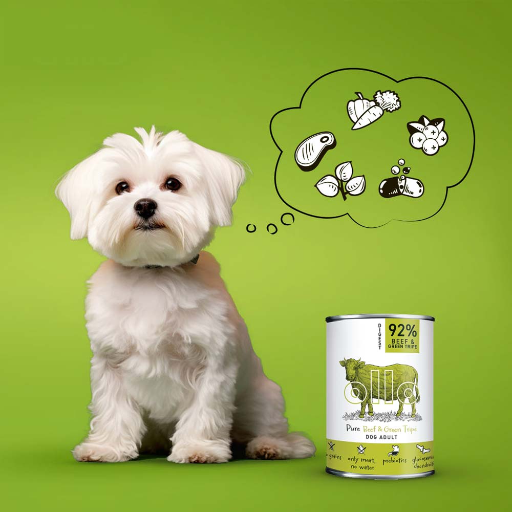 OLLO REINES RINDFLEISCH UND GRÜNES RINDFLEISCH Vollständiges, komplettes Futter für ausgewachsene Hunde aller Rassen. Ohne Zusatz von Wasser oder Bouillon, um das Fleisch nicht unnötig zu verdünnen. Monoproteinformel für Hunde mit Nahrungsmittelallergien, zusätzlich mit grünem Pansen zur Unterstützung des Verdauungssystems. Ideal für Hunde mit empfindlichem Verdauungstrakt. Zusätzliche Unterstützung für Gelenke, Fell und Haut sowie für das Verdauungs- und Harnsystem. Frei von Getreide, Gluten und Hülsenfrüchten. Alle Inhaltsstoffe sind natürlich. Sehr reichhaltige Mischung aus Kräutern, Vitaminen und Mineralien, die in anderen Futtersorten nicht enthalten sind.